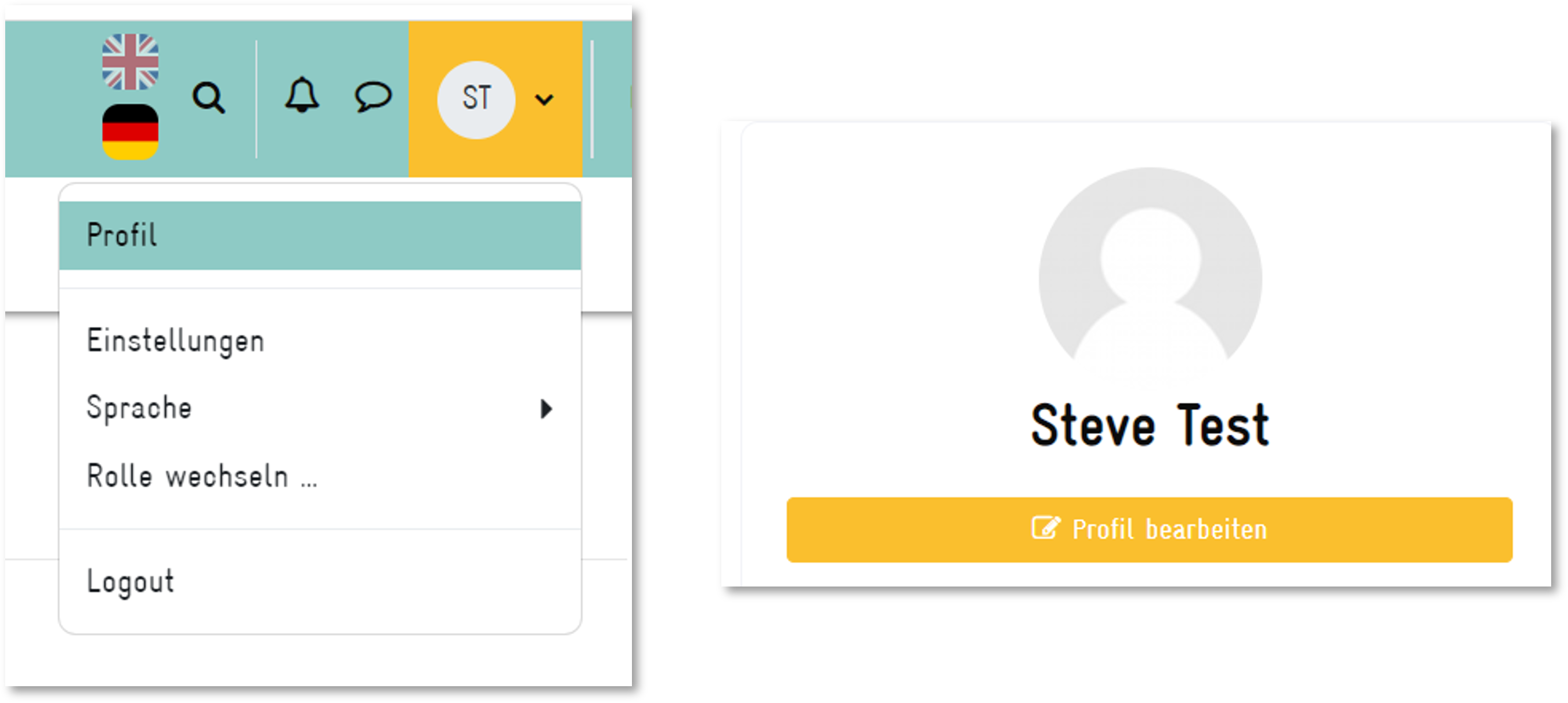 Um Profilinformationen zu ergänzen und damit leichter gefunden zu werden, klicke auf dein Profilbild (dem Kreis mit deinen Initialen) in der rechten oberen Ecke und im Drop-down-Menü auf "Profil".