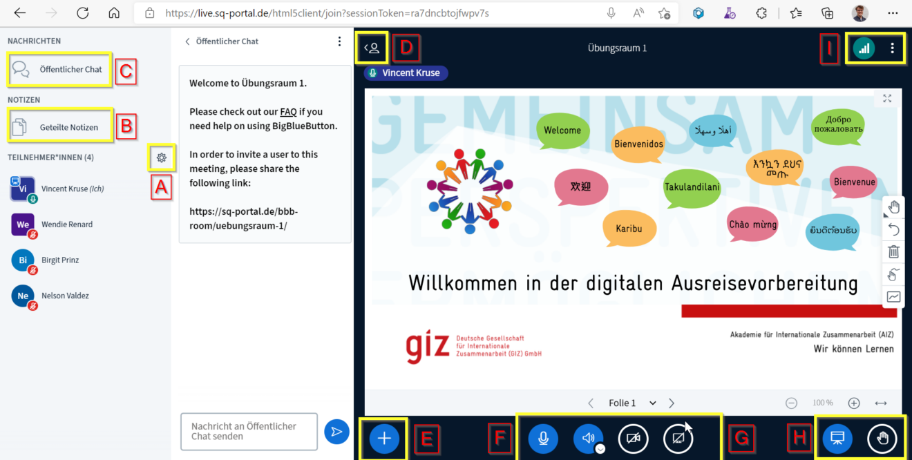| Answer: If you have any questions, our support will help you. BBB is an open source software designed specifically for digital learning. Therefore, as a "virtual classroom", in addition to classic video conferencing functions such as screen sharing or chat, it also includes surveys and also possibilities for collaborative work within the framework of shared notes or a whiteboard. Here you can find an overview of the user interface: As a participant you may have a limited functional view. Roles: Moderators have a square icon around their initials on the left side of the participant list, participants have a round symbol. | |||