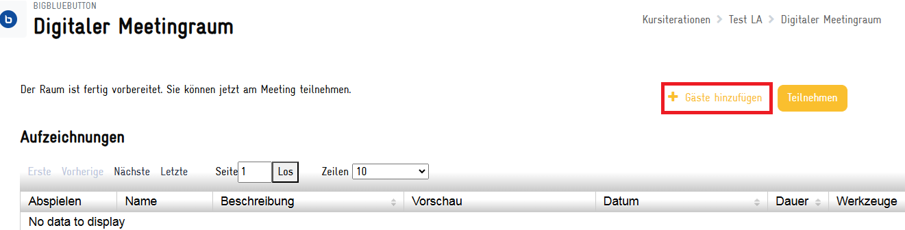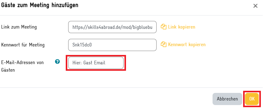 | Answer: Wenn du externe Gäste in dein Training einbeziehen möchtest, müssen diese vorab manuell eingeladen werden. Hier eine Schritt für Schritt Anleitung: 1. Zuerst auf den digitalen Meetingraum gehen und auf das Feld oben rechts "+Gäste hinzufügen" klicken. ![]() 2. Anschließend öffnet sich ein kleines Fenster. Entweder die Gast-E-mail Adresse eingeben und auf "ok" klicken oder den Meetinglink und Passwort kopieren und per Email schicken. ![]() Anleitung für Gäste Falls ein Gast sich unsicher mit der digitalen Lernumgebung fühlt, kann ihm das Guests' manual for BigBlueButton geschickt werden, damit in einer Schritt-für-Schritt Erklärung auf Englisch nachverfolgt werden kann, wie er sich als Gast einloggt. Die pdf findet sich hier als Download im Anhang. | |||